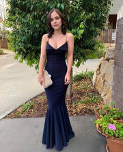Deep blue camisole long dress with deep V-neckline and thin camisole. The lower body is fishtail shaped, suitable for dinners, dances, etc Prom, black tie events, formal weddings, and upscale parties