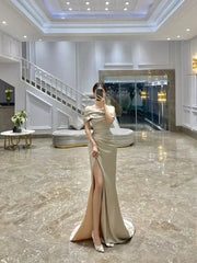 Elegant Mermaid Off The Shoulder Ruffles Satin Slit Prom Dresses Evening Dress formal wear dresses simple gentle atmospheric and unique desi Bring summer colors to enhance whiteness