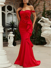 Mermaid Evening Gown Elegant Dress Formal Sweep / Brush Train Short Sleeve Off Shoulder Pocket Stretch Crepe with Pleats