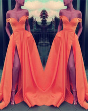 Orange off shoulder long dress with off shoulder design and deep V-neckline, high slit on the side, suitable for dinners, parties, etc