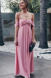 Pink off shoulder long dress with off shoulder design and twisted elements on the upper body, suitable for weddings, dinners, etc Prom, black tie events, formal weddings, and upscale parties