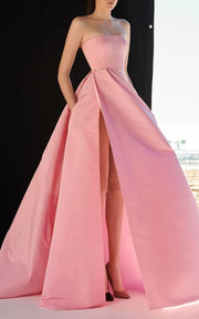 Pink Strapless Ball Gown with High Slit and Pockets pink long prom dress Party Dresses black tie events, formal weddings, and upscale parties