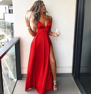 This red camisole long dress features a deep V-neckline and thin straps that add an elegant touch. Its side high slit enhances movement and style, making it an ideal choice for dinners, parties, and special events. The sleek design combines sophistication with comfort, allowing you to make a confident statement wherever you go.