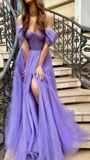 Sexy Mermaid Long Prom Dress Glitter Purple A-Line Sequin Tulle Prom Dress Off The Shoulder Celebrity Dress