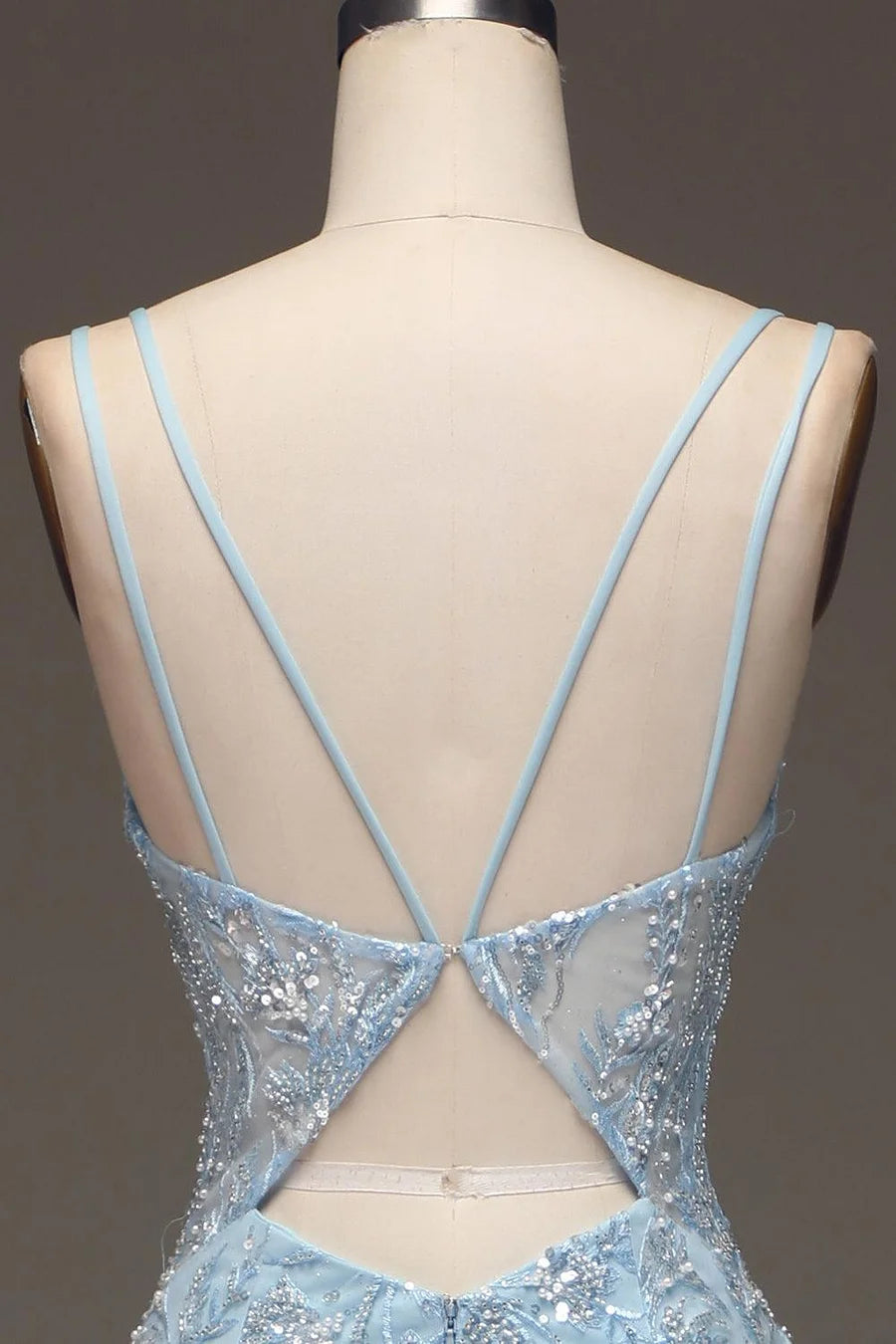 Spaghetti Strap Sleeveless Mermaid Appliques Long Prom Dress With Front Split - US 2 / UK 6 / EU 32