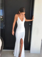 White Spaghetti Strap Maxi Dress with High Slit Mermaid Spaghetti Straps Sweep Train White Prom Dress with Split Party Dresses