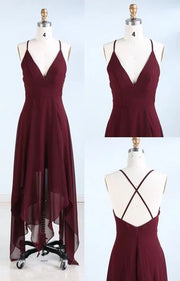 Wine red camisole long dress with deep V-neckline and thin camisole, irregular skirt with short front and long back, suitable for dinners, weddings, etc Prom, black tie events, formal weddings, and upscale parties
