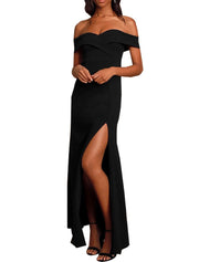 Women's Black Dress Prom Dress Party Dress Ruched Split Off Shoulder Short Sleeve Winter Dress Wedding Guest Formal Black White Spring Fall