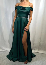 A-Line Off-the-Shoulder Sleeveless Satin Prom Dress/Evening Dress with Pleated Waistband Split Simple gentle atmospheric and unique design