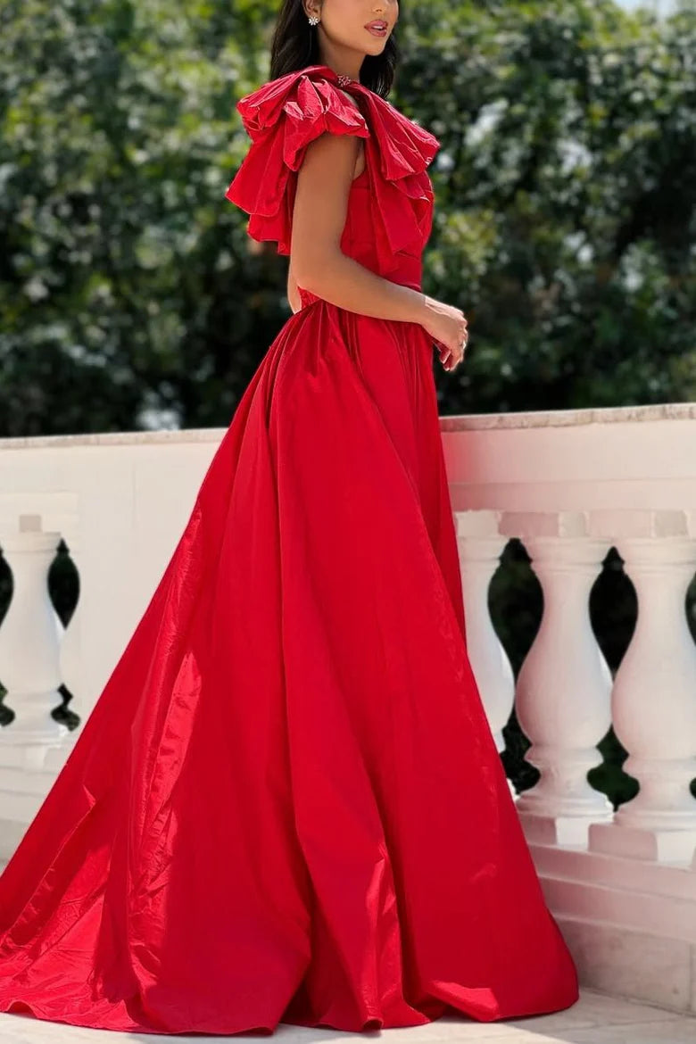 A-Line One Shoulder Satin Pleated High Slit Formal Prom Dress with Bow