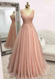 A-Line V-Neck Sleeveless Glitter Prom Dress/Evening Dress With Appliqued Beading for Floor-Length Tulle Look Simple gentle atmospheric and unique design
