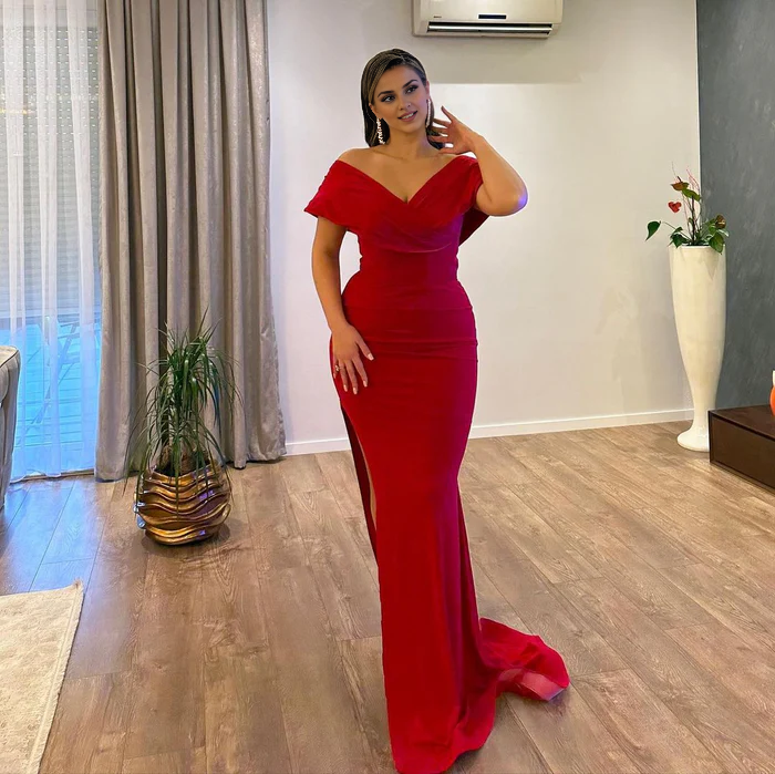 Beautiful Floor-Length V-Neck Off-The-Shoulder Mermaid Ruby Prom Dress with a Split Skirt