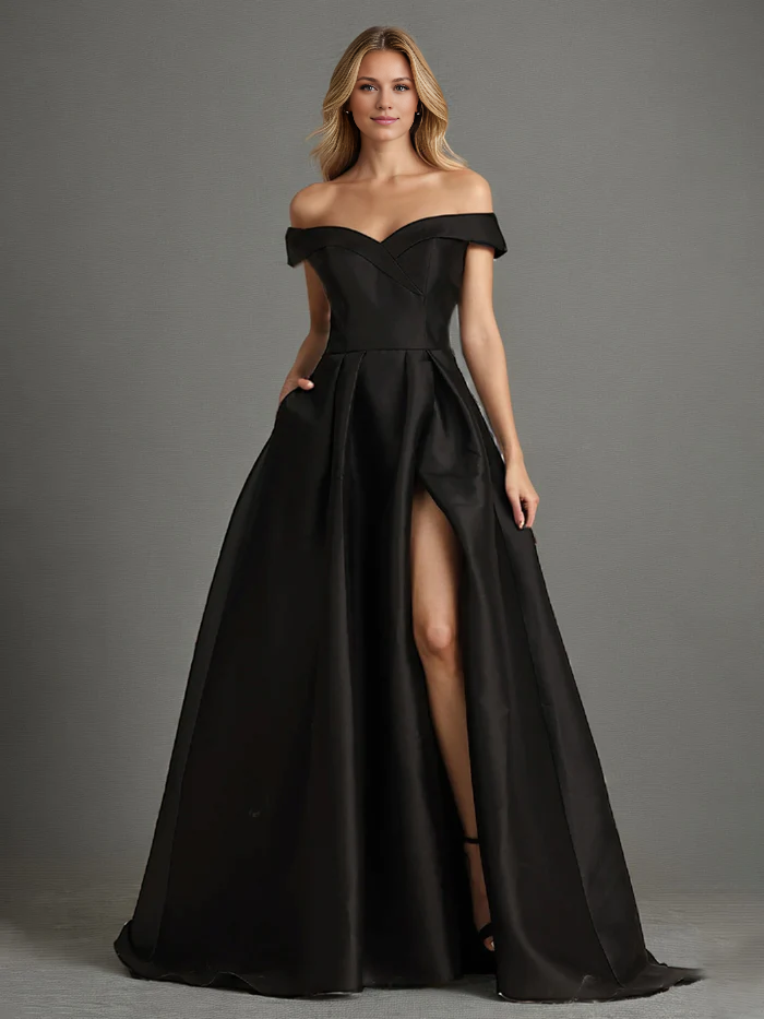 Black Long Prom Dresses Elegant A Line Off The Shoulder Long Satin Prom Dress With Slit