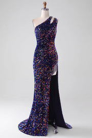 Black Mermaid One Shoulder Sequins Long Prom Dress with Slit simple gentle atmospheric and unique desi