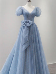 Blue Tulle V Neck Tulle Long Prom Dress Blue Sweet 16 Dress