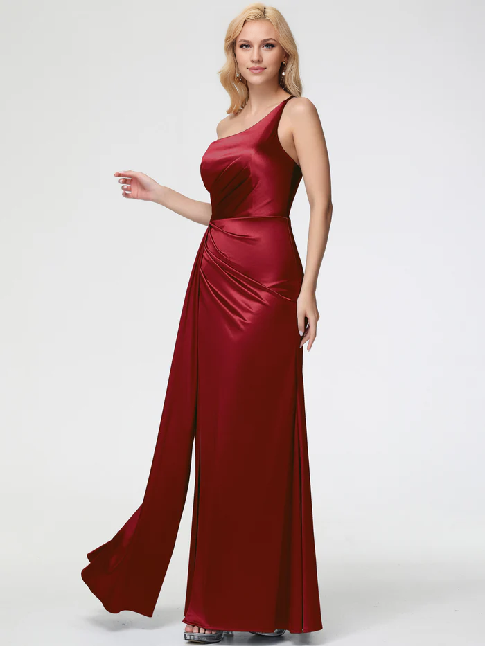 Burgundy Prom Dresses Trumpet/Mermaid One Shoulder Sleeveless Pleats Stretch Satin Prom Dresses With Split