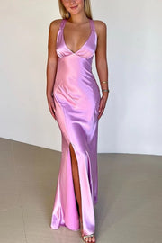 Chic Straps V-Neck Pleated Sleeveless Satin Long Prom Dress with Slit