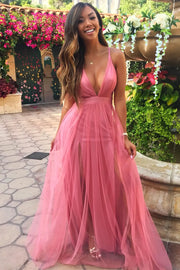 Deep V Neck Tulle Long Prom Dresses V Neck Formal Graduation Evening Dresses