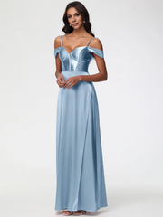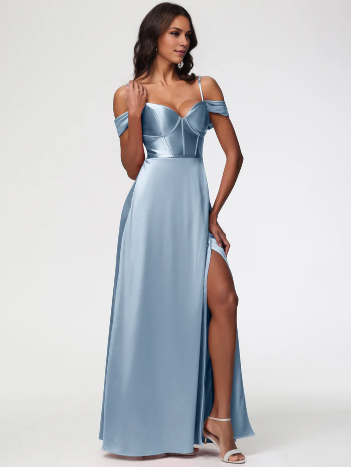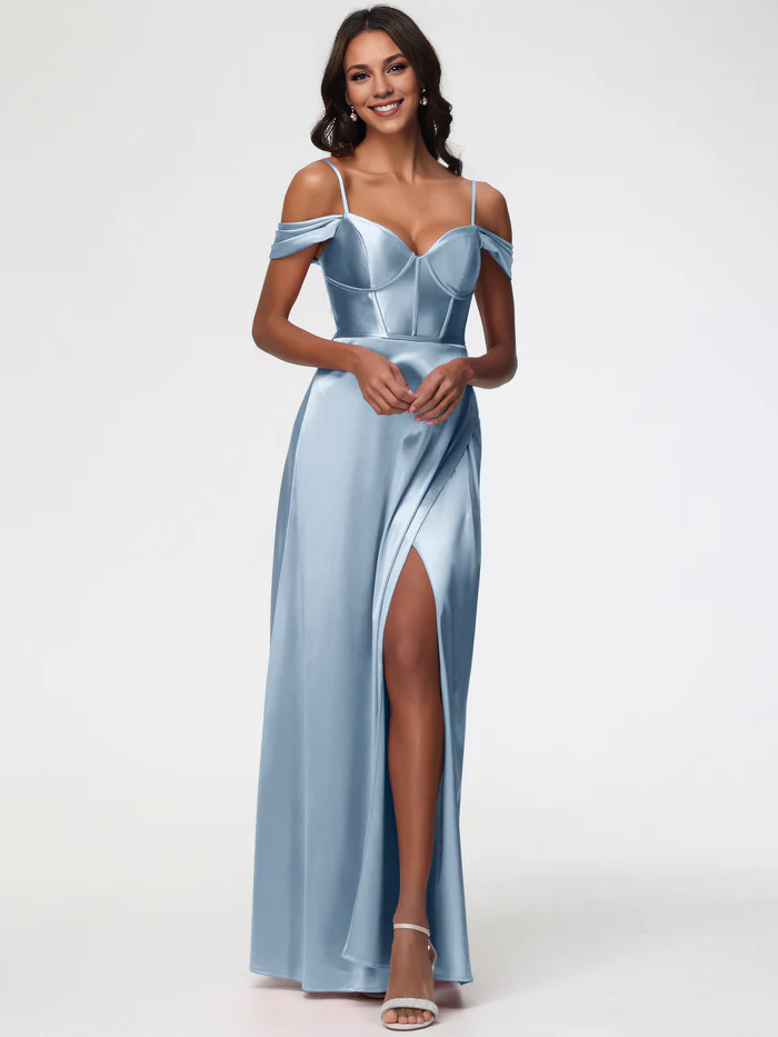 Dusty Blue Prom Off The Shoulder Sweetheart Spaghetti Straps Long Stretch Satin Prom Dress