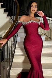 Elegant Long Burgundy Mermaid Rhinestone Prom Dress with Long Sleeves Simple gentle atmospheric and unique design