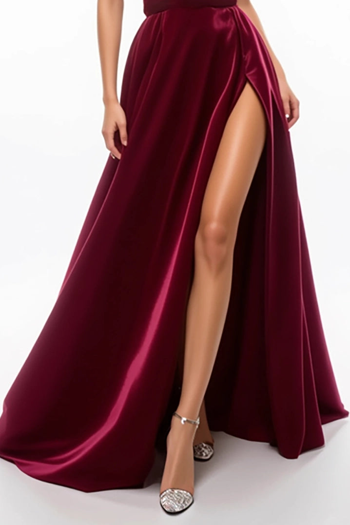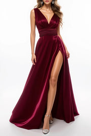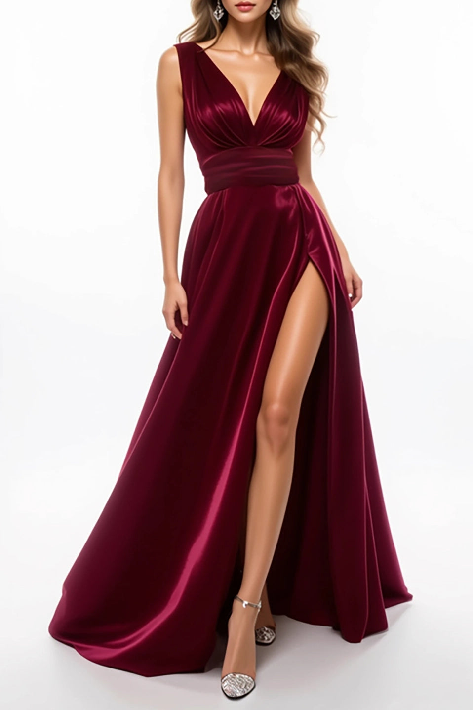 Evening Formal Gown Burgundy Deep V High Slit Floor-Length Dress Simple beautiful generous and full of charm