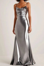Evening Party Dress Silver Spaghetti Strap Metallic Floor-Length Gown Simple beautiful generous and full of charm