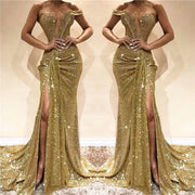 Gold Off-the-Shoulder Prom Dress Sequins Long Slit Simple gentle atmospheric and unique design