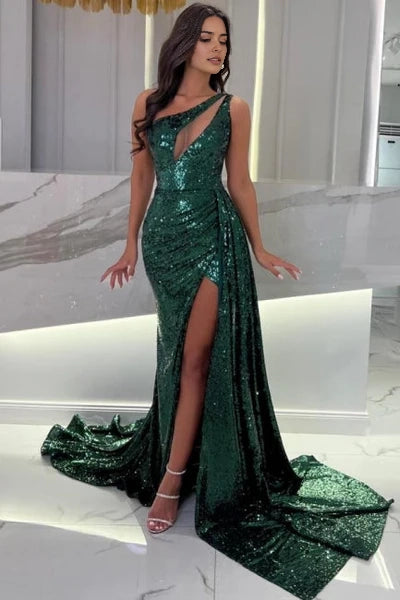 Gorgeous Long Dark Green One Shoulder Sleeveless Sequined Prom Dress with Slit Simple gentle atmospheric and unique design