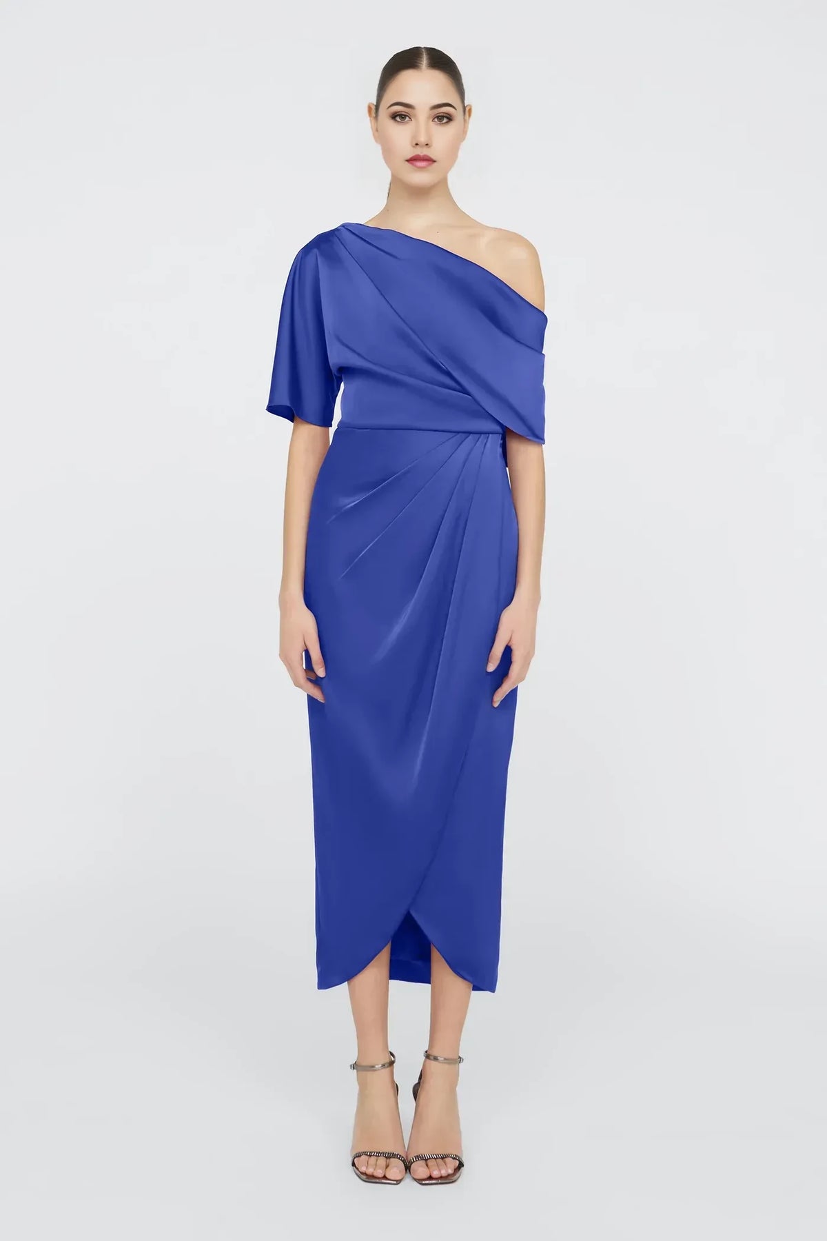 Graceful Sheath One Shoulder Short Sleeve Draped Back Midi Length Prom Dress - US 2 / UK 6 / EU 32