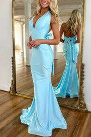 Halter V-Neck Satin Mermaid Pleated Long Formal Prom Dress with Bow