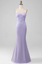 Lilac Sheath Strapless Corset Prom Dresses With Lace Appliques Simple gentle atmospheric and unique desig