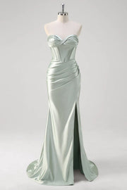 Matcha Mermaid Sweetheart Satin Ruched Long Corset Prom Dress with Slit simple gentle atmospheric and unique desi
