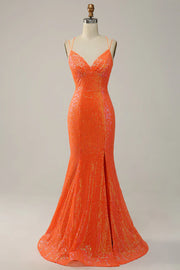 Mermaid Spaghetti Straps Orange Sequins Prom Dress with Split Front Simple gentle atmospheric and unique design