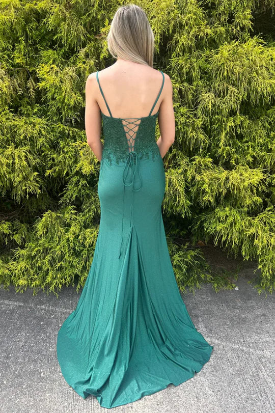 Mermaid Spaghetti Straps V-Neck Appliques Long Prom Dress with Slit - US 2 / UK 6 / EU 32 / Green