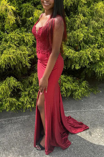 Mermaid Spaghetti Straps V-Neck Appliques Long Prom Dress with Slit