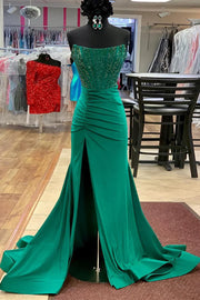 Mermaid Strapless Scoop Beads Pleated Formal Prom Dress with Slit