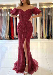 Modern Prom Dress/Evening Dress with Sequins - Trumpet/Mermaid Off-the-Shoulder Short Sleeve Sweep Train Simple gentle atmospheric and unique design