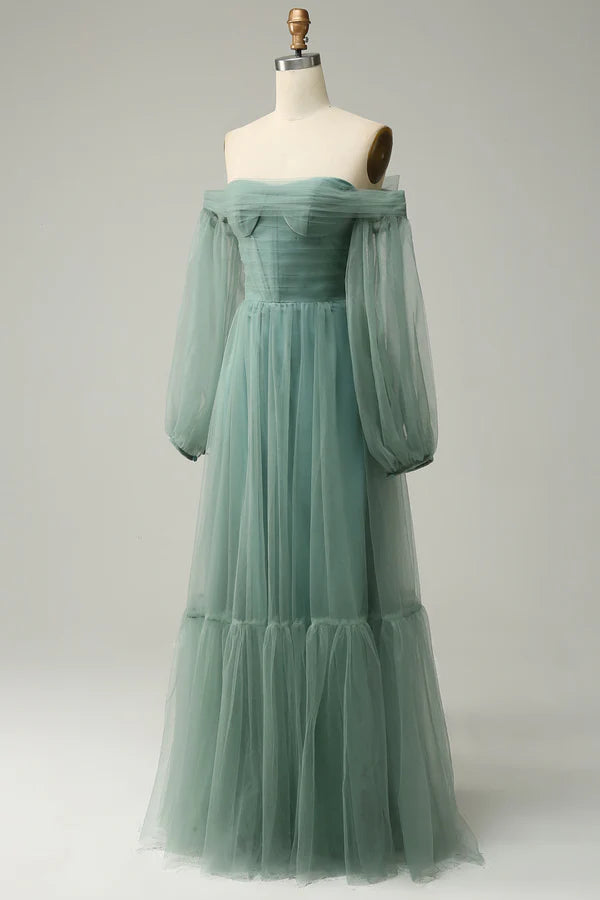 Off The Shoulder Grey Green A-Line Tull Prom Dress With Long Sleeves Simple gentle atmospheric and unique design
