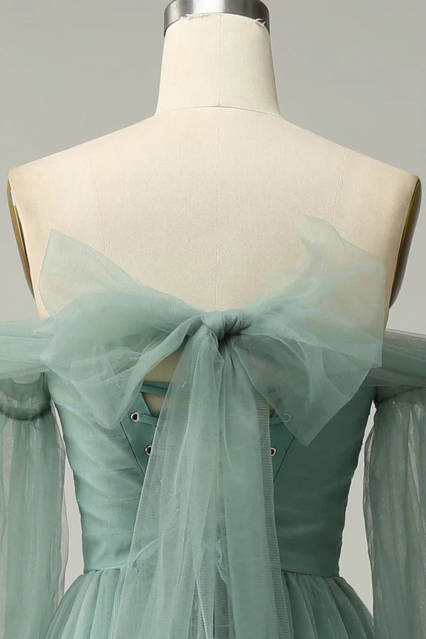 Off The Shoulder Grey Green A-Line Tull Prom Dress With Long Sleeves Simple gentle atmospheric and unique design - US 2 / UK 6 / EU 32