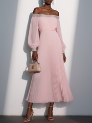 Pink Pleated Chiffon Off The Shoulder Long Sleeve Balloon Sleeve A-Line Maxi Dress