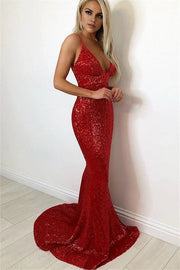 Red V-Neck Sequins Prom Dress Mermaid Sleeveless Simple gentle atmospheric and unique design