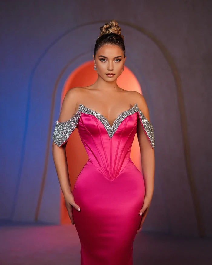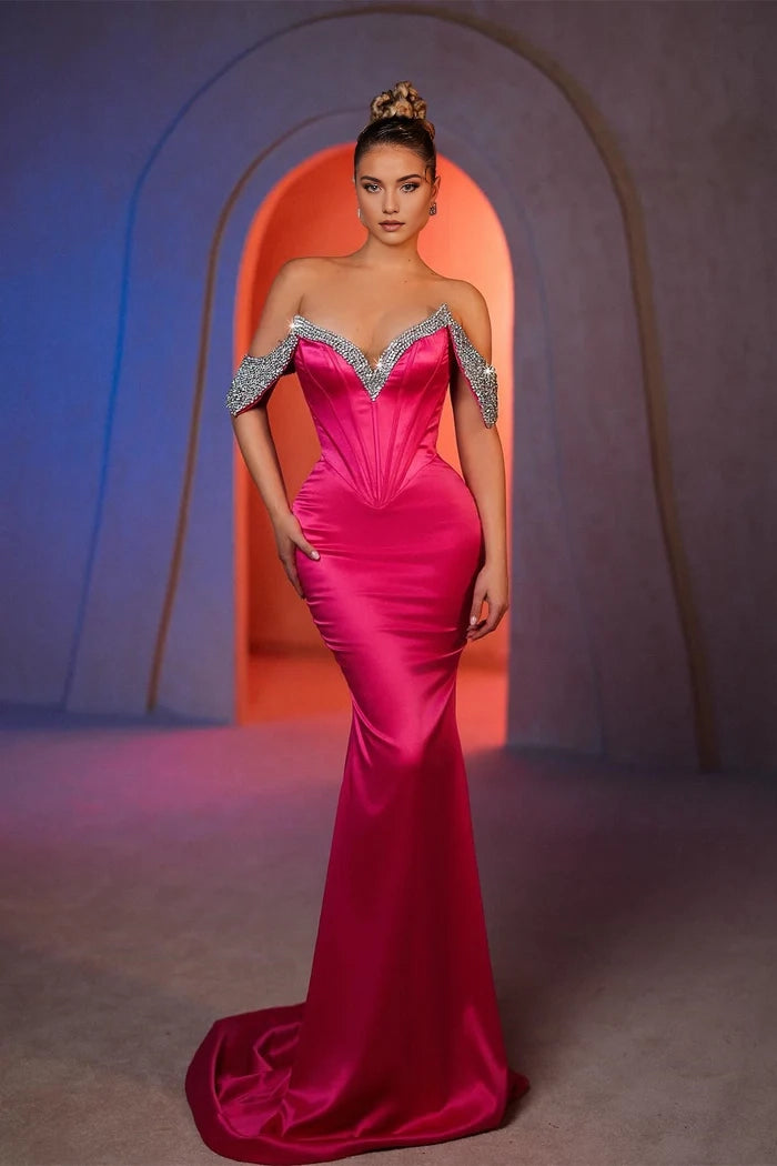 Sexy Mermaid Off-the-shoulder Sleeveless Rhinestone Satin Prom Dress Simple gentle atmospheric and unique design
