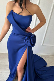 Sexy Simple Long Royal Blue Strapless Satin Prom Dress with Side Slit Simple gentle atmospheric and unique design