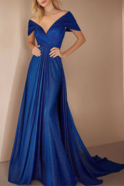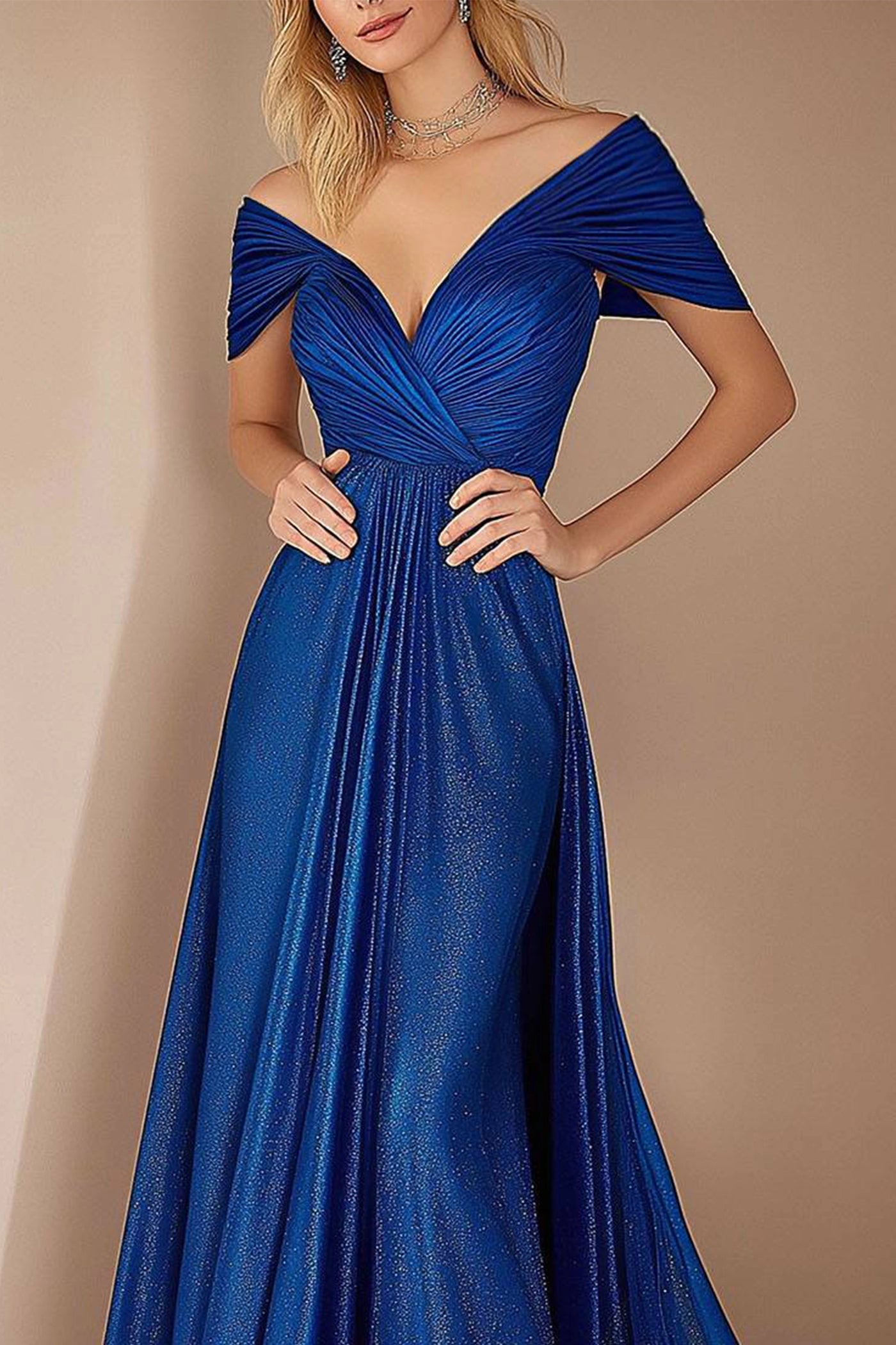 Simple beautiful generous and full of charm Evening Prom Blue Dress Off Shoulder Pleated Glitter Floor Length Dress - US 2 / UK 6 / EU 32
