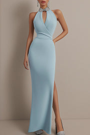 Simple beautiful generous and full of charm Prom Dress Wedding Guest Dress Light Blue Halter Neck Sleeveless Side Slit Maxi Dress