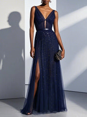 Simple beautiful generous and full of charm Purplish Blue Mesh Classic V Neck Sleeveless Sheath Maxi Dress