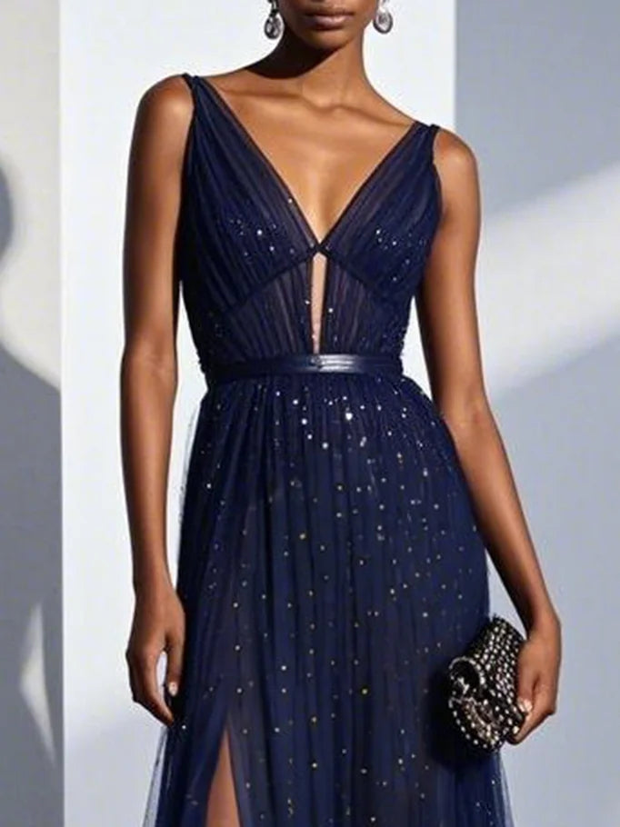 Simple beautiful generous and full of charm Purplish Blue Mesh Classic V Neck Sleeveless Sheath Maxi Dress - US 2 / UK 6 / EU 32