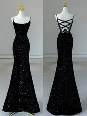 Simple Mermaid Sequin Black Long Prom Dress Black Evening Dress