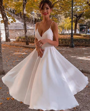 Simple V Neck White Prom Dress Tea Length Saint Formal Wedding Party Dress