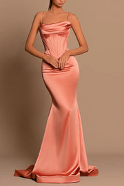 Spaghetti Straps Sleeveless Mermaid Satin Pleated Long Prom Dress